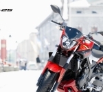 MT-25'in ergonomik gidon/sele/ayaklık düzeni, bu modeli sınıfının en rahat ve çok yönlü motosikletlerinden biri yapmak üzere dik sürüş pozisyonu sağlamak için tasarlanmıştır. Kompakt arka kısım, ön kısımdaki gövdenin yoğunluğu ile kontrast oluşturacak şekilde tasarlanarak agresif bir kütle önde siluet elde edilmiştir.