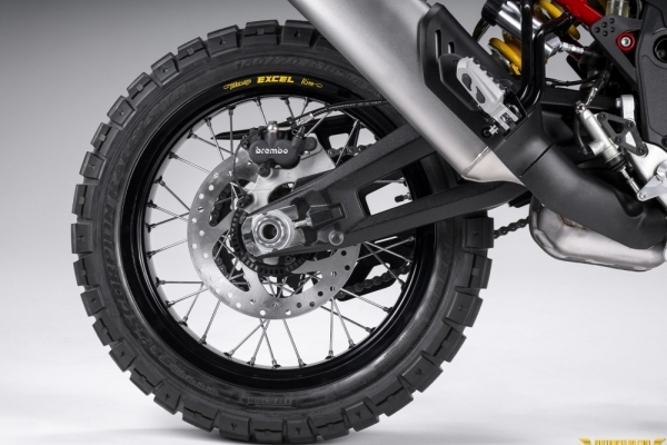 Biraz daha yaklaşıp detaylara baktığınızda yeniliklerin sadece çamurluk ve renk şemasından ibaret olmadığını görüyorsunuz. Excel marka karbon çelik telli jantlar ve Pirelli Scorpion Rally STR lastikler offroad kullanım için ideal duruyor. Süspansiyon sisteminde KYB'nın daha üst düzey modelleri kullanılmış. 250mm ile eskiye göre 20mm daha fazla hareket mesafesi sunan 48mm kapalı kartuş ters ön çatallar sönümleme ve geri tepme ayarları sunuyor. Arkada ise yine 20mm artarak 240mm hareket mesafeli, 46mm pistonlu KYB monoşok amortisör bulunuyor ve o da tamamen ayarlanabiliyor. Arka amortisörün bağlandığı alüminyum maşanın bağlantı noktası da değişmiş. Ayrıca, öne Öhlins gidon amortisörü eklenmiş. Tüm bu değişimler motosikletin yerden yüksekliğini 30mm arttırarak 280mm'ye çıkarmış. Ekstralar motosikleti sadece 1 kg ağırlaştırmış.