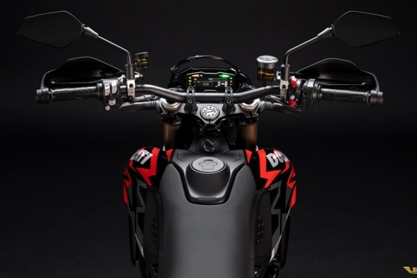 Tasarım olarak önceki büyük hacimli Hypermotard modellerinin çizgilerini taşıyor ancak hafifliğini ve çevikliğini daha keskin ve ince tasarımıyla öne çıkarıyor. Çünkü motosikletin benzinsiz dolu ağırlığı 151 kg ve 12 litrelik bir yakıt deposu var. Fabrika tüketim verisi ise 100 km'de 4.8 litre.