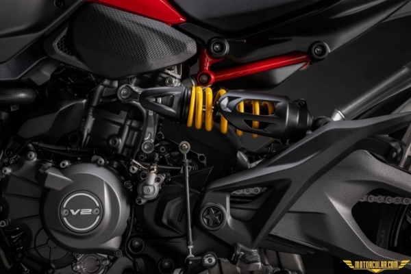 Süspansiyon tarafında önde 43 mm'lik ayarsız Showa çatal, arkada ön yükleme ayarlı monoshock görev yapıyor. Sele yüksekliği 815 mm, ancak aksesuar sele ve alçaltma kitiyle 775 mm'ye düşürülebiliyor. Şimdilik standart ve 'Plus' versiyonlar arasında yalnızca ön grenaj ve arka sele kapağı farkı var. Ancak ileride daha donanımlı bir versiyonun gelmesi olası. Yine de aynı motoru kullanan Streetfighter V2 ile model konumlandırması açısından bazı çakışmalar olabilir. Fren sistemi Brembo imzası taşıyor: önde 320 mm çift disk ve M4.32 radial kaliperler kullanılmış. Jant ölçüleri 120/70x17 ve 180/55x17, lastiklerse Pirelli Diablo Rosso IV. Yeni Monster'da gidonlar biraz daha ileri alınmış, yakıt deposunun altındaki paneller ise sert frenlerde tutuşu artıracak şekilde kaplanmış.