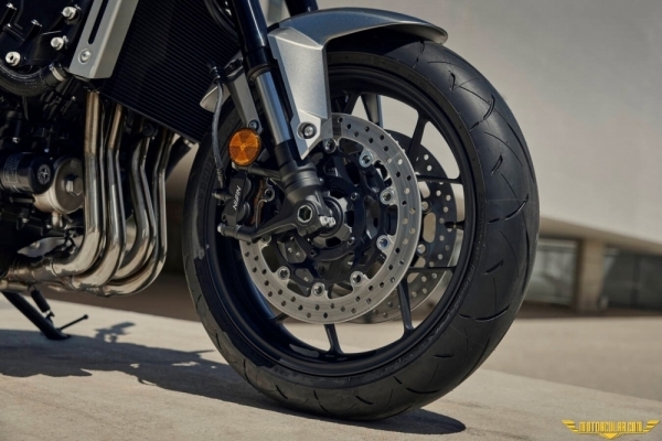 CB1000F'in kalbinde, denenmiş ve güvenilir CBR1000RR Fireblade motoru bulunuyor. Ancak bu motor, farklı bir karakter kazanması için ciddi şekilde yeniden elden geçirilmiş. Emme ve egzoz subap zamanlamaları yeniden düzenlenmiş, hava emiş sistemi optimize edilmiş. Sonuç olarak 9.000 devirde 122 hp güç ve 8.000 devirde 103 Nm tork üretiyor. Bu da günlük sürüşte her devirde keyifli, dengeli ve güçlü bir performans sağlıyor. Ayrıca motorun çıkardığı ses, dört silindirli motora özgü benzersiz bir tınıya sahip. Sürüş konforu ve performans için ön tarafta 41 mm Showa SFF-BP USD amortisörler, arkada ise ayarlanabilir Showa Pro-Link sistemli bir amortisör kullanılmış. Fren performansı içinse dört pistonlu radial montajlı ön kaliperler ve 310 mm'lik dalgalı diskler görev yapıyor.