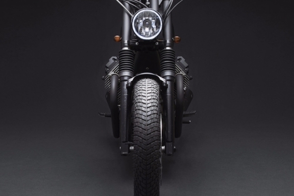 V7'nin boyası sade ve kusursuz, fakat olayı güzelleştiren, ince detaylar. Silindir kapakları daha klasik olanları ile değiştirilmiş. GPS gösterge ve özel yapım MASS Moto susturuculardaki Venier logoları da dikkat çekiyor.