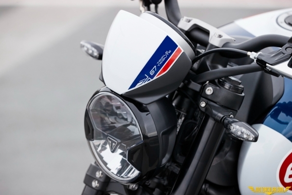 Tasarım olarak 1970'li yıllarda Isle of Man TT gibi yarışlarda yer alıp üst üste birçok şampiyonluğa imza atmış olan 750cc Triumph Trident 'Slippery Sam' modelinin kırmızı, beyaz ve mavi renk şemasından esinlenilmiş. Yandaki yarış numarası dikkatleri üzerine çekiyor ve anlamını bilmeyenlerde merak uyandırıyor. Ülkemizde ise Zonguldak plaka kodu zannedenler bile olabilir.