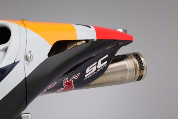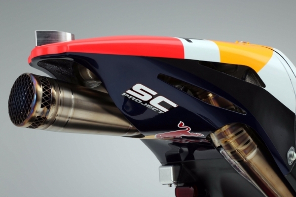 Granajdaki değişikliklerin yanında, yeni SC Project egzoz dikkat çekiyor. Eski Termignoni sisteme oldukça benzese de borular akıcı bir çizgi yerine daha keskin hatlar çiziyor. Yan boruların daha uzun olması ise Honda'nın V4 motorda yaptığı yeni ayarların bir göstergesi olabilir.